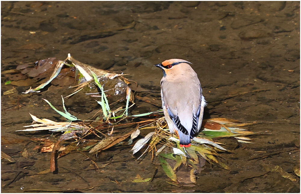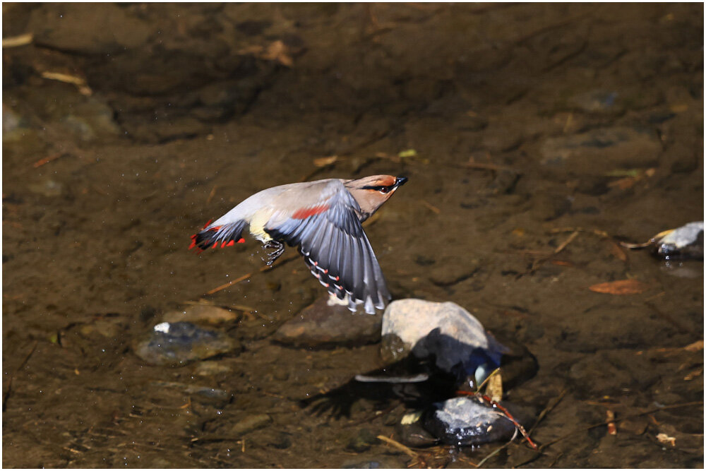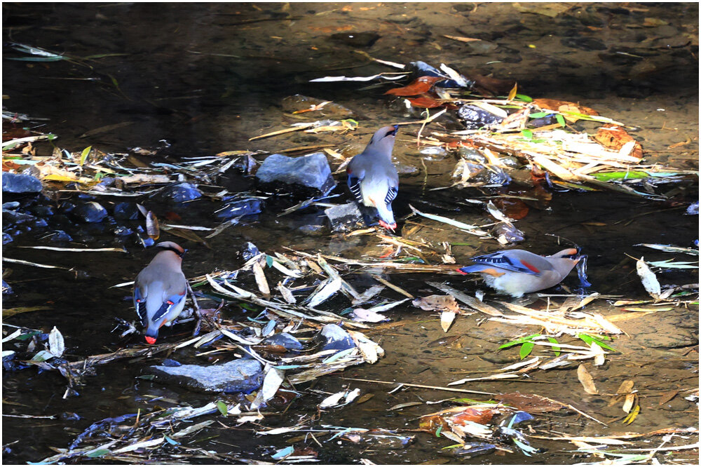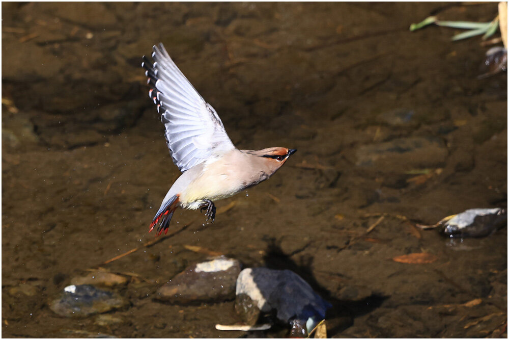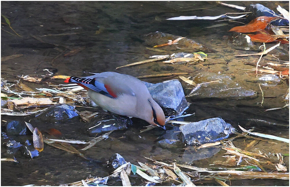 開いた羽の先が白かったり、尾羽は先が赤くてきれいですね。